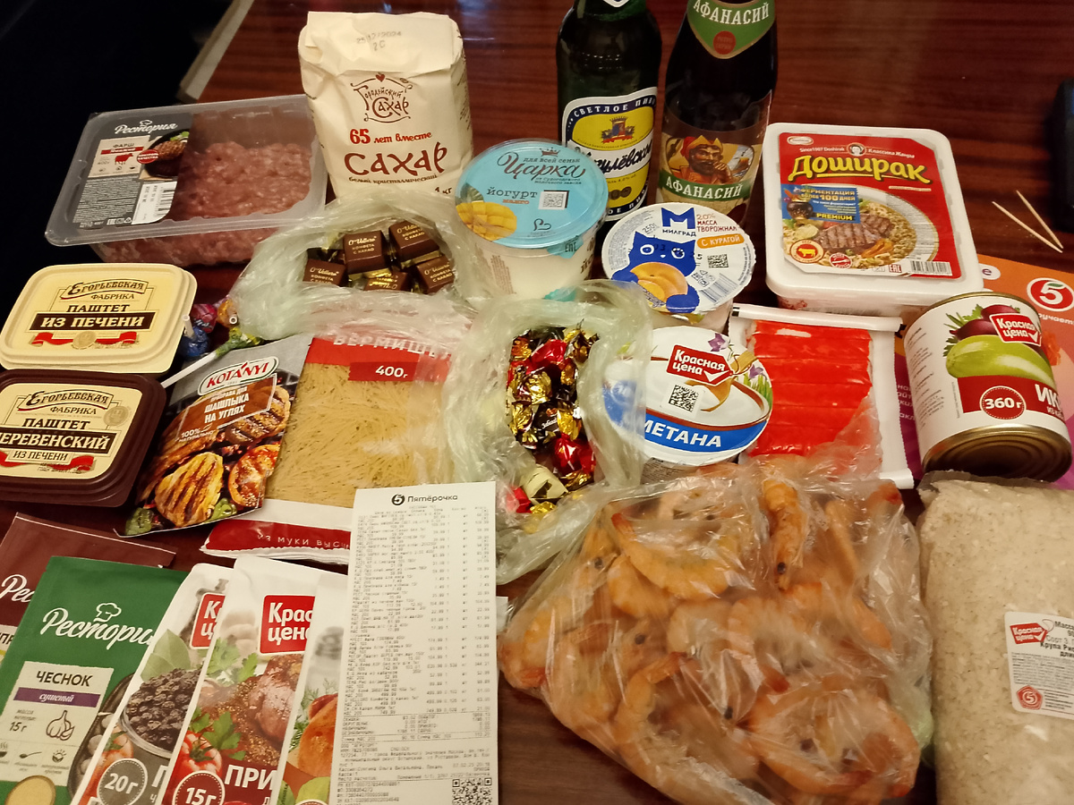 Как вы знаете, я занимаюсь сложным лечением своего зуба. Пришлось вчера идти за лекарствами в аптеку, потом на почту по делу, а там и в магазин решили зайти. Питаться нормально мне пока сложно, жевать мясо, курицу не могу. Вот задалась целью купить что-то мягкое. А то сидеть на манке не очень хотелось. Хотя я ее в принципе люблю. И вот по итогу купили в "Пятерочки" такие продукты. Хотела взять какую-нибудь рыбную пасту, но не нашла нужную. Выбрала паштет "Егорьевский" два вида. Для всех фарш говяжий купили, по акции был. Массу творожную купили, йогурт "Царка" и сметану. Это из молочного. Йогурт такой рекомендую, особенно тем, кто не любит приторные молочные продукты. Ах, да, ещё купили развесные креветки. Относительно недорогие, рублей 650 за кг. Рис обычный. А то дома закончился, а везде в магазинах он какой-то дорогой. Кабачковой икры захотелось такой простой. Она, кстати, менее жирная, чем в стеклянных банках. Крабовые палочки прихватила. Доширак и пиво 🍺 не для меня, как вы п