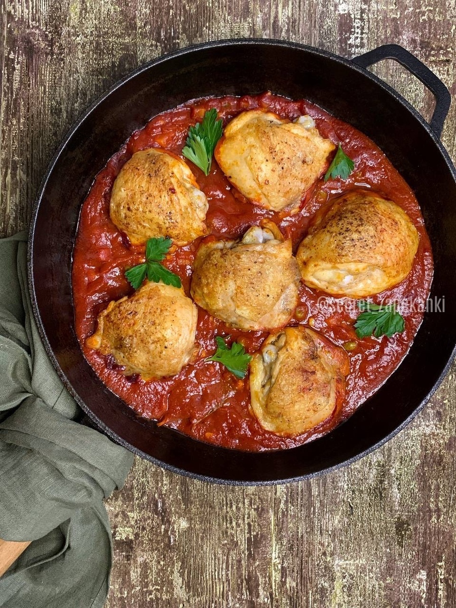 Базовый рецепт, который легко подстроить под себя. Заменить бёдра на ножки или кусочки целой курицы – легко. Хрустящая корочка на кожице или мягкая протушенная в соусе – пожалуйста. Добавить больше овощей или заменить на другие – тоже не проблема. Соус понасыщеннее или более лёгкий – лейте побольше воды, бульона и меньше томатов и не заморачивайтесь. Мало специй – сыпьте ваши любимые. Просто придерживайтесь принципа «мне вкусно так»!