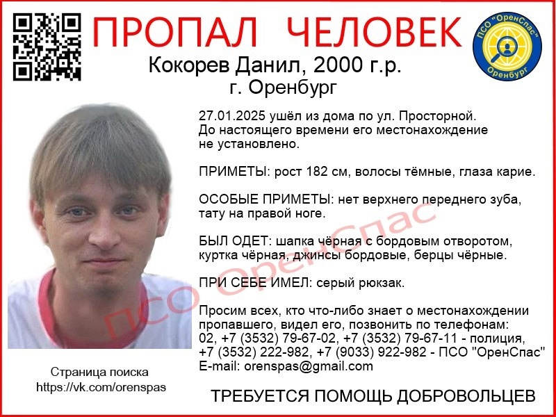 Полиция и волонтеры ПСО «ОренСпас» ведут поиски молодого мужчины, пропавшего в Оренбурге в конце января. Данил Кокорев 2000 года рождения ушел из дома на улице Просторной 27 января текущего года. О его местонахождении до сих пор ничего не известно. Приметы: рост 182 см, волосы тёмные, глаза карие. Особые приметы: нет верхнего переднего зуба, тату на правой ноге. Был одет: шапка чёрная с бордовым отворотом, куртка чёрная, джинсы бордовые, берцы чёрные. При себе имел: серый рюкзак. Всех, кто что-либо знает о пропавшем, просят позвонить по телефонам 02, +7 (3532) 79-67-02, +7 (3532) 79-67-11 — полиция, +7 (3532) 222-982, +7 (9033) 922-982 — ПСО «ОренСпас»