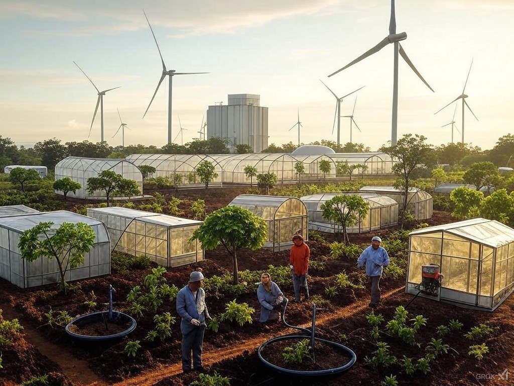 Начнем с малого: установим несколько ветряных генераторов, мини-гидроэлектростанцию и посадим первую партию павловнии. Постепенно расширяем инфраструктуру, добавляя теплицы, животноводческие фермы и перерабатывающие мощности.