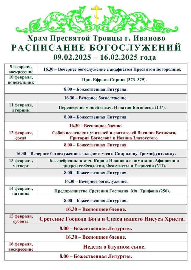 09-16.02. Расписание богослужений в Троицком храме города Иваново