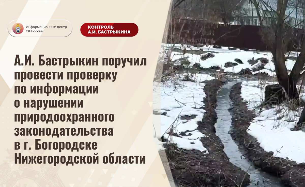 А.И. Бастрыкин поручил провести проверку по информации о нарушении природоохранного законодательства в г. Богородске Нижегородской области В СМИ и социальной сети сообщается, что в результате ненадлежащего функционирования канализационного коллектора в городе Богородске Нижегородской области неочищенные отходы сбрасываются на рельеф местности, а также попадают в реку Рязанку. Указанное приводит к загрязнению почвы и водоема, однако мер к разрешению ситуации не принимается. Председатель Следственного комитета Российской Федерации Александр Иванович Бастрыкин поручил руководителю СУ СК России по Нижегородской области Айрату Саетовичу Ахметшину провести процессуальную проверку и представить доклад об установленных в ходе первоначальных проверочных мероприятий обстоятельствах, а по завершении проверки – о ее результатах. Исполнение поручения, а также ход процессуальной проверки поставлены на контроль в центральном аппарате ведомства. #СледственныйКомитет #СКРоссии #СК #ИЦСКР #Информационны