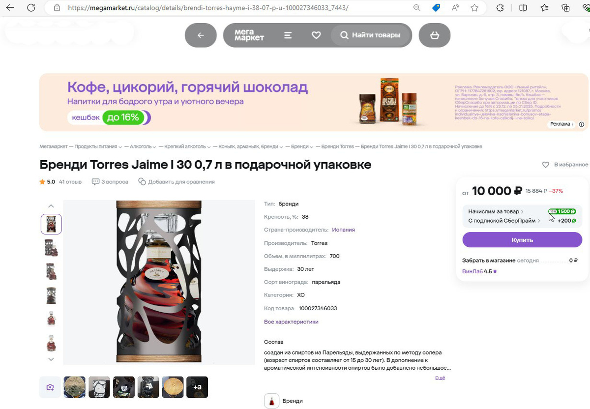 Я уже не раз советовал моим подписчикам покупать винлабовские позиции алкоголя через сайт СберМегаМаркета - тут иногда можно словить кешбэк до 40-50%! Правда, перед новым годом настолько щедрого кешбэка на коньяки не давали, но купить за 8 500 руб такое чудо дизайна - уже везение! ;) К "Хайме первому" я присовокупил водку "Ортодокс" ржаную, так как на неё тоже был хороший кешбэк!