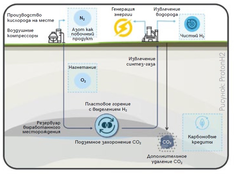 Канадская компания ProtonH2 запустила в Саскачеване проект Apollo по организации производства недорогого водорода. Инноваторы обещают продавать газ по цене менее доллара за килограмм. Предприятие разместится на выработанном нефтяном промысле. Через нагнетательную скважину под землю будет подаваться кислород. В процессе внутрипластового горения нефти образуется синтез-газ (смесь водорода и угарного газа), который через добывающую скважину поступает наверх для разделения на H2 и CO. Угарный газ в смеси с метаном направляется на производство электроэнергии, а водород и азот (побочный продукт кислородного производства) отгружаются заказчикам. В выработанном месторождении обычно остаётся значительное количество нефти (от 30 до 50% от первоначального), и она послужит не только сырьём, но и источником энергии для водородного производства. Возможность исключить дорогостоящую водоподготовку, использовать готовые скважины и получать собственную электроэнергию способствует снижению затрат в сравн