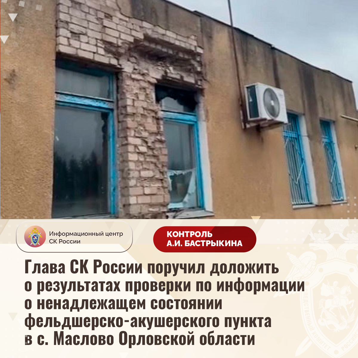 Глава СК России поручил доложить о результатах проверки по информации о ненадлежащем состоянии фельдшерско-акушерского пункта в с. Маслово Орловской области В СМИ и социальной сети сообщается, что в связи с длительным протеканием кровли фельдшерско-акушерского пункта в селе Маслово Орловской области в помещениях образовалась плесень, отделочные материалы пришли в негодность. Вместе с тем напольные покрытия в учреждении отсутствуют, оконные стеклопакеты повреждены. Отмечается, что в настоящее время организована лишь реконструкция крыши, работы по ремонту стен, потолочных и напольных покрытий не начаты. В региональном следственном управлении по данному факту организована процессуальная проверка. Председатель Следственного комитета Российской Федерации Александр Иванович Бастрыкин поручил и.о. руководителя СУ СК России по Орловской области Андрею Николаевичу Чапанову представить доклад о ходе и результатах процессуальной проверки, поставив ее на контроль в центральном аппарате ведомства.