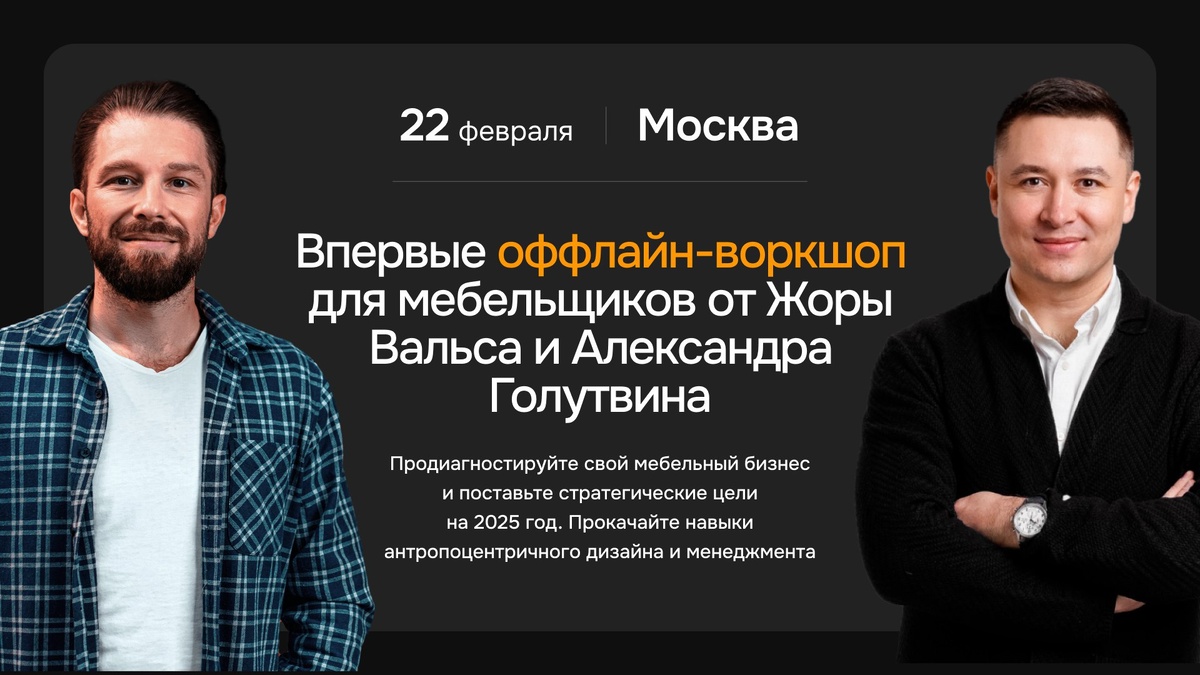 📣 Живая встреча в Москве с Жорой Вальсом и Александром Голутвиным День Икс настал! 22 февраля мы впервые организуем живое мероприятие в Москве для предпринимателей из мебельной индустрии. Встреча пройдет в формате воркшопа "А что такое воркшоп?" Воркшоп (“workshop” с англ. «мастерская») — это формат обучающего мероприятия, которое помогает участникам получить знания и сразу применить их на практике для формирования определенных навыков. "А что будет на самом воркшопе?" В рамках воркшопа Александр Голутвин проведет стратегическую сессию, на которой разберет бизнес одного из участников воркшопа. Изучив инструменты диагностирования бизнеса, постановки цели и создания плана по реализации цели, вы отработаете все полученные знания на практике прямо на воркшопе под руководством Александра! Жора Вальс погрузит вас в мир антропоцентричного дизайна, где потребности и особенности каждого клиента становятся ключевыми при создании мебели. "Сколько продлится воркшоп?" Это будет насыще