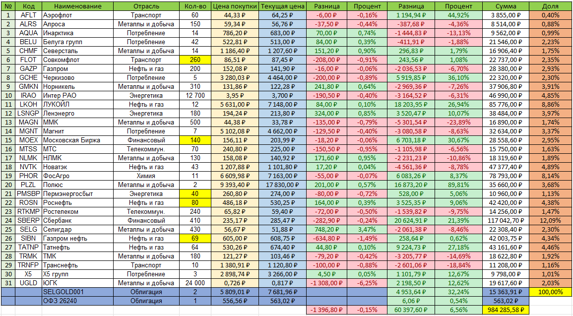 А нынешняя стоимость портфеля составляет 984 508 рублей.