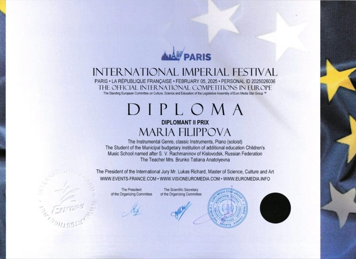 Воспитанница кисловодской Детской музыкальной школы имени С. В. Рахманинова Мария Филиппова стала победительницей Международного конкурса International Imperial Festival в Париже. Конкурс объединил молодых музыкантов из разных стран, предоставив площадку для демонстрации исполнительского мастерства. Как сообщили в администрации города-курорта это не первое достижение в копилке юной кисловодской пианистки. В прошлом году Мария завоевала диплом и признание жюри международного конкурса «Искры талантов». За подготовку талантливой исполнительницы благодарность получила и преподаватель Марии Татьяна Анатольевна Брунько. Отметим, конкурс International Imperial Festival способствует развитию молодых музыкантов и предоставляет возможности для обмена опытом и культурного взаимодействия.