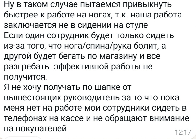 Сегодня буду жаловаться Сначала про обстановку по работе Я пришла на работу, работаю второй день, и у нас на кассе песка и земли прям на полках, с полсантиметра, так как девочки садятся на полку шкафа, имеющую, как будто для этого, небольшой выступ, на который худой человек вполне может сесть, и закинуть свои лапки в кроссовках и кедах, в которых же они курить и покупать еду бегают В общем, во второй день я эту кассу отмыла и пол отмыла просто начисто, и попросила в нашей официальной беседе лапки туда не ставить и фотки приложила Около кассы есть стул, но он поставлен между этим самым шкафом и стеллажом, так что места там не сильно много, и камеры его единственного не видят. И на нем я стала сидеть когда ноги ноют от усталости или когда они болят, о чем я расскажу в следующем посту Девочки все равно стали ставить ноги на кассу и обещали за собой убирать песок, а потом такие: “ а сидеть где?” Или “я что, каждый день должна это делать?” Мне кажется что да Но не суть, прибралас