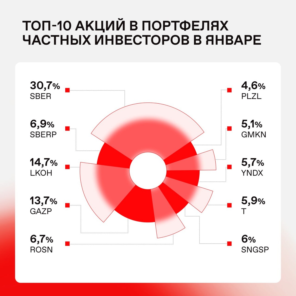 Как выглядит портфель акций РФ у среднего инвестора («народный портфель») на Мосбирже по итогам января: 1. Сбербанк ао - 30,7% 2. Лукойл - 14,7% 3. Газпром -13,7% 4. Сбербанк ап - 6,9% 5. Роснефть - 6,7% 6. Сургутнефтегаз ап - 6% 7. Т-Технологии - 5,9% 8. Яндекс - 5,7% 9. Норникель - 5,1% 10. Полюс - 4,6% Т-Технологии теперь на 7 строчке вместо 9-й с долей 5,9%. Яндекс с Норникелем сдвинулись на позицию вниз. Вместо Татнефти на 10-й строчке теперь снова акции Полюс. По секторам: Нефтегаз - 41,1% Банки - 43,5% IT - 5,7% Цв. металлургия - 5,1% Золото - 4,6%