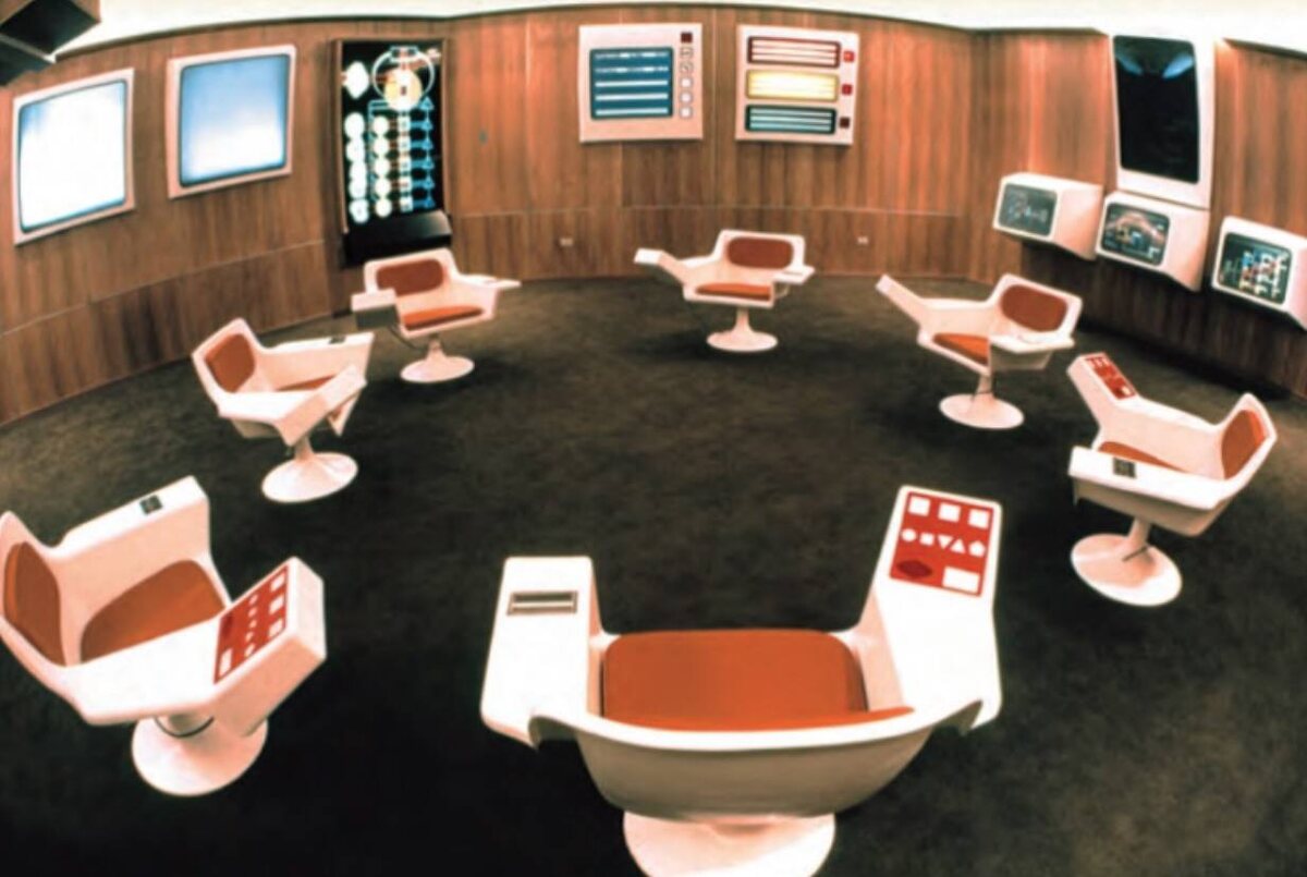 То, что вы видите на фотографиях вовсе не декорации фантастического фильма. Это 3D модель операционного зала системы Cybersyn. После прихода к власти в Чили Сальвадора Альенде в 1970 году он начал проводить массу реформ. К примеру его команда вознамерилось национализировать все наиболее важные предприятия страны. Встал вопрос, а как всем этим управлять? Ведь новоявленные государственики не были управленцами. Один из сотрудников агентства, по этой самой национализации, решил привлечь к руководству кибернетику! Правда все его знания основывались лишь на одной книге. Которую, в свою очередь написал британец Стаффорд Бир. Именно он и решил применить кибернетику в области менеджмента. Он попытался найти баланс между стабильностью и автономией основных частей. Правда вот незадача, на дворе 1971 год, в распоряжении команды лишь один компьютер. Во всем Чили вообще в то время было чуть менее 60 ЭВМ. Тогда Бир создаёт паутину из имеющихся в наличии телексных аппаратов. Программы написание коман