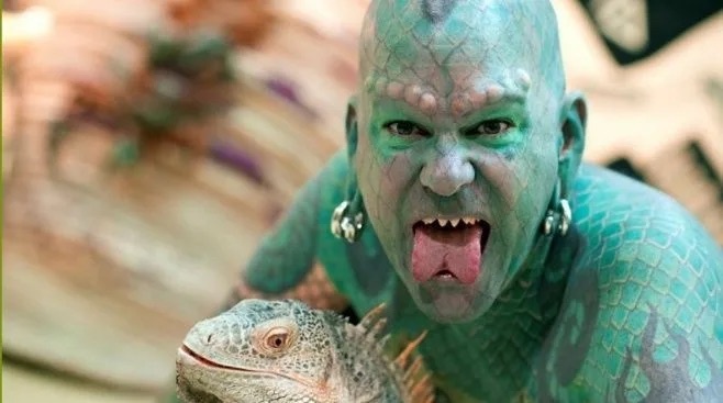 Эрик Спраг: Человек-ящерица, бросивший вызов нормам В мире, где самовыражение часто ограничивается рамками социальных норм, Эрик Спраг, известный как «Lizardman» (Человек-ящерица), стал живым символом свободы и трансформации. Его тело, покрытое зелёными чешуйчатыми татуировками, раздвоенный язык и острые клыки заставляют одних замирать в недоумении, а других — восхищаться смелостью. Но за экстравагантным образом скрывается история человека, который превратил свою мечту в реальность, преодолев страх осуждения. Эрик Спраг родился в 1972 году в штате Нью-Йорк, США. С ранних лет его привлекало всё нестандартное: от рептилий в местном зоопарке до фантастических фильмов. В интервью он вспоминает: «Мне нравились ящерицы — их сила, грация, умение адаптироваться. Они казались идеальными существами». Однако путь к трансформации начался не сразу. Эрик изучал математику и психологию в университете, но тяга к самовыражению перевесила. В 1994 году он сделал первый шаг к своей мечте — татуир