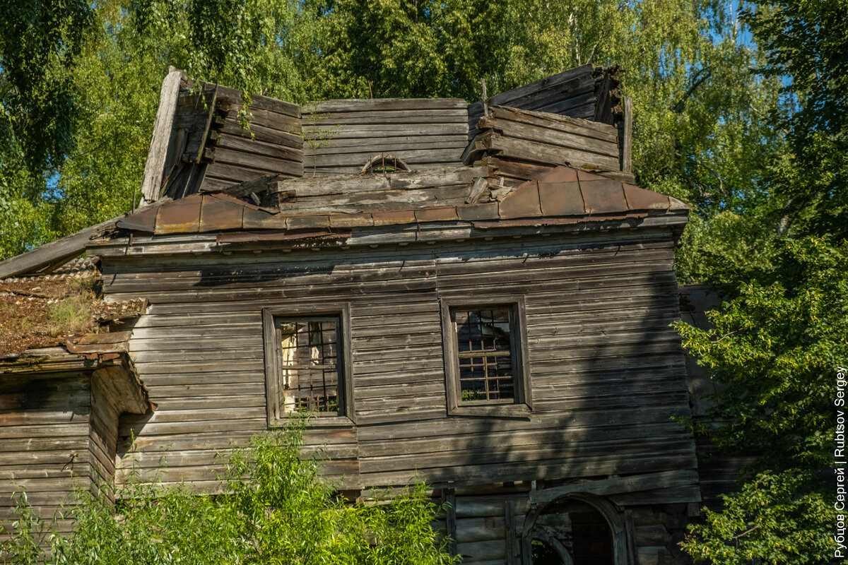 Итак, папа с другом гуляли по лесу, продираясь, как придется, потому что тропинок там не было никаких — в ближайшей деревне явно уже давным-давно никто не жил, или, по крайней мере, в этой части леса не гулял. Деревья вокруг были высокие, стояли плотно. И вдруг, обогнув очередное дерево, папа... практически уперся в деревянную стену. Верится с трудом, но он утверждает до сих пор, что вообще ее не видел ни между деревьями, ни над верхушками. При ближайшем рассмотрении оказалось, что они с другом вышли к заброшенной церквушке. Или даже просто часовенке, потому что состояла вся конструкция из одной-единственной башенки с остроконечным (так называемым шатровым) сводом и крестом на его верхушке.