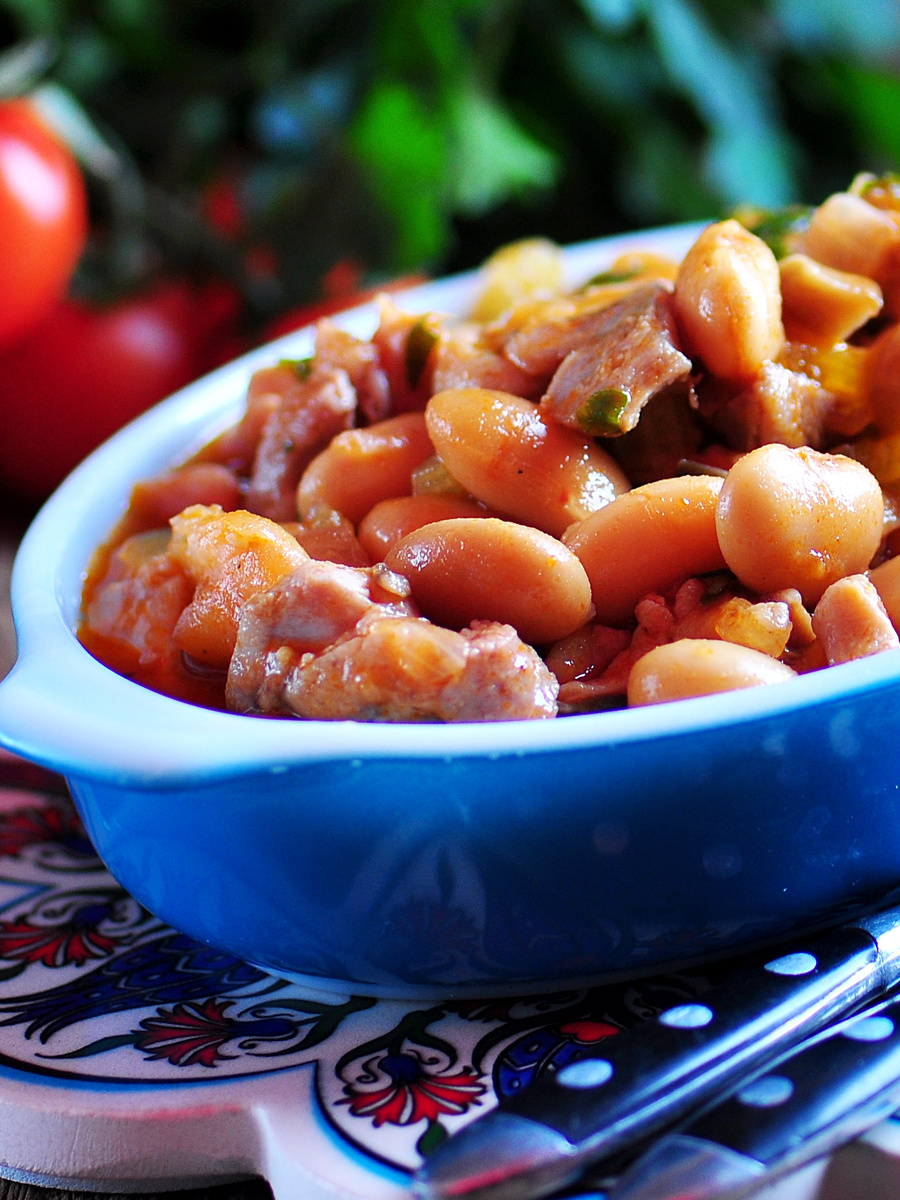 4. Открываем банку фасоли и выливаем всё содержимое в сковороду. Если хочется побольше подливы – доливаем немного воды, но без фанатизма. Солим, перчим по вкусу, уменьшаем огонь и тушим 15 минут.