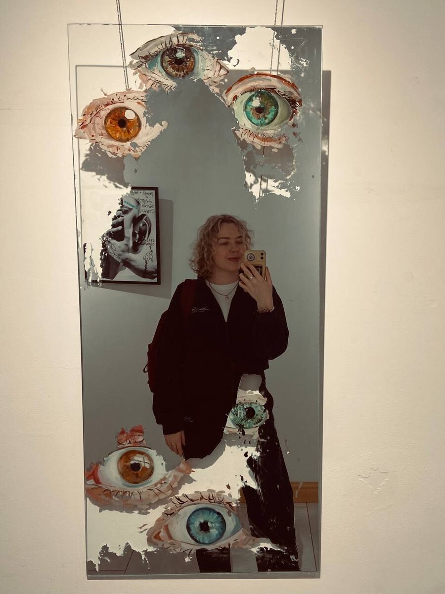 📍ул. Шиллера, 3, Калининград Это креативное пространство, там музей и коворкинг, книги стоят, по всюду зелено.. красота! Конечно кофе наливают, печеньки дают) Поговорим о музее, была выставка «пока я сплю» она как-бы интегрирована в коридоры самого коворкинга, кстати впервые такое вижу.. но мне это не мешало) ну так вот, мне понравился подход! Стили, техники, формы очень разные, все разное) знаете, там были супер детализированные картины и минималистичные абстракции. Там даже был кактус огромный из бумаги, который подвесили к потолку и внутрь него можно заходить и смотреть рисунки тоже.. но больше всего мне понравилось это зеркало.. ну как красиво а, вы посмотрите, во-первых сами глаза роскошные, а во-вторых ну вы видите обработку да? Что где-то есть это зеркальное покрытие, а где-то нет .. молодцы! Выставка реально кайфовая была, если бы жила в Калининграде - то каждую неделю бы ходила к ним 💔 #рекомендация #музей #Калининград
