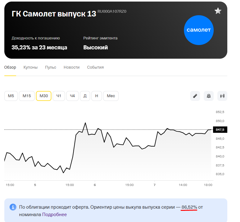 Здравствуйте. В этой статье расскажу что такое оферта в облигации. Официальное определение оферты - это период времени, в который можно продать облигацию эмитенту по номиналу. Но на практике не всегда получается так. Например "ГК Самолет" недавно по нескольким облигациям (вроде по 5-ти) запустила оферту. На своей практике я впервые столкнулся с офертой, изначально подумал что можно сбыть по номиналу облигации с прибылью (покупал я существенно ниже номинала) и вложить деньги во что-то не менее прибыльное по более низкой цене. Но тут меня ждало небольшое разочарование... В целом это не проблема. Я всегда планирую держать облигации до погашения. Это не инвестиционная рекомендация, а моя позиция:) И вообще предусмотрена ли она. Если оферта по "бумаге" предусмотрена это можно увидеть в карточке по облигации в разделе "Информация о выпуске". Пример: Наличие или отсутствие оферты в облигации это еще один триггер для анализа доходности. Но лично я не ориентируюсь на оферту, будет посмотрю по к