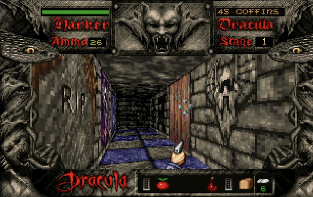 Игра делится всего на три уровня, что вроде бы немного. Герой должен найти определенное количество гробов (несколько десятков на каждом уровне) и освятить их с помощью святой воды. Гробы являются не только удобным местом для сна, но и точкой респауна нечистой силы: скелетов, зомби, вампиров, антропоморфных летучих мышей (помните, в такую превратился Граф Дракула в фильме). Чтобы Джонатану было удобно убивать восставших из могил, игра имеет вид от первого лица и чем-то напоминает Wolfenstein 3D. Однако, в отличие от обилия экшена, который нам предлагает детище id Sotware, Bram Stoker's Dracula меньше ориентирован на перестрелки и больше на блуждания по лабиринтам уровня - это роднит её со старенькими Hovertank 3D или Catacomb 3-D. А ещё в этой игре я заметил небольшое сходство с Ultima Underworld из-за наличия инвентаря и необходимости производить боевые действия с помощью мышки. "Боевые действия" я назвал так, потому что некорректно было бы называть местную боевую систему как "перестрелки". Конечно, у Джонатана есть огнестрельное оружие - пистолет, но только одно из двух, а второе - нож. И вот так, с ножом и пистолетом, ему нужно уничтожить главного кровососа всей Трансильвании, а вместе с ним его подельников.