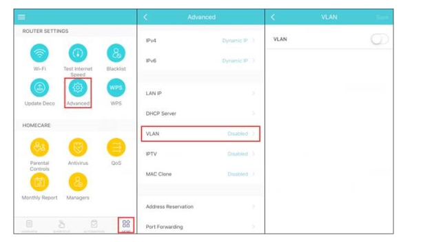 - Откройте Deco App, перейдите в More → Advanced → VLAN.