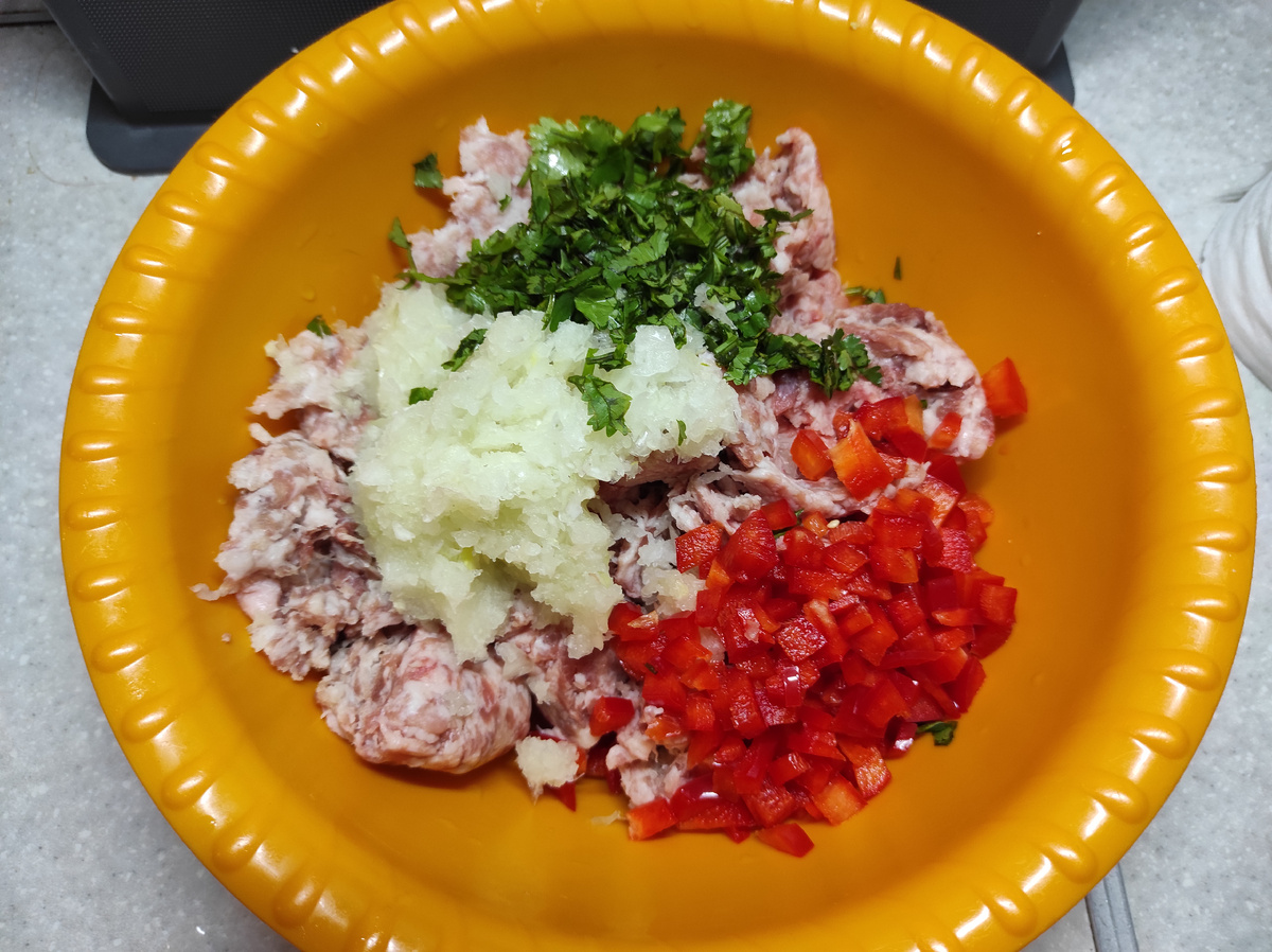 Как -то купила у местного производителя котлеты с овощами. Это очень вкусно! Но зимой они пропали. Продавец объяснил, что не выгодно их делать, когда овощи дорогие. Так они исчезли из ассортимента совсем. Вряд ли дело в овощах. Скорее всего, работница, которая их делала, уволилась и рецепт унесла вместе с собой. В ленте мне попался рецепт "сочный любя-кебаб в духовке". " ЛюБя-кебаб"?!Это что -то новое или оговорочка автора по Фрейду? Стоит протестировать. Среди ингредиентов овощи. Может, оно, то самое, чей вкус я не могу забыть?! Выходные- это единственная моя возможность экспериментировать с рецептами. Рецепт сочного "любя-кебаб" (буду так называть, чтобы не нарушить авторские права😄) очень прост. 1 кг. фарша 2 луковицы 1сладкий перец Пучок кинзы 100 мл воды Соль, перец, паприка Я добавила ещё 1 яйцо. Если есть, чего бы не добавить?! Смешиваем фарш. У меня жирный домашний. Следующий раз, а он будет, я соединю говяжий или куриный фарш со свиным. Добавляем мелко нарезанный лук,