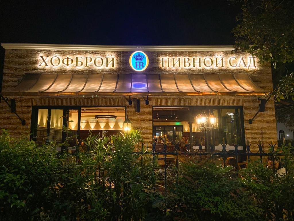 Уголок Баварии в центре Сочи с настоящим немецким пивом и традиционными закусками. Другие открытия Сочи Бар «Хофброй» расположен в центре города, недалеко от морпорта — на улице Несебрская, 26. Новый паб, на сей раз немецкий, открыли основатели другого бара — Dublin, ирландского, который успешно работает в Сочи уже больше шести лет. А название бара отсылает к известным пивным ресторанам и одноименной пивоварне баварских герцогов, основанной Вильгельмом V в Мюнхене в далеком XVI веке и работающей до сих пор. Снаружи — большой внутренний дворик с обилием зелени, внутри — атмосфера традиционного паба с витриной сувениров прямиком из мюнхенского «Хофброя». На кране четыре вида Hofbräu München: классическое, темное, белое и безалкогольное пиво (по 450 руб.). А также шнапс и вино, в том числе яблочное, тоже родом из Германии. Меню краткое и понятное, что облегчает выбор. Попробуйте традиционный баварский картофельный салат (350 руб.), который готовят в мюнхенской вариации: с маринованными и