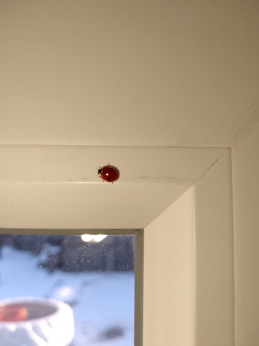Подошла к окну в спальне, чтобы полить цветы,а там ползает по стеклу божья коровка.