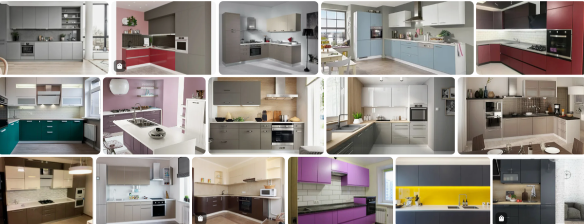 Но начнем мы с вами с палитры. Вот мы входим в кухню. Там мы видим кухонный гарнитур. И это всегда матовые однотонные фасады в эмали или под пленкой. И у них всегда одинаковые цвета — это кремовый, светло-серый, светло-бежевый, но иногда встречаются и другие, более яркие оттенки.