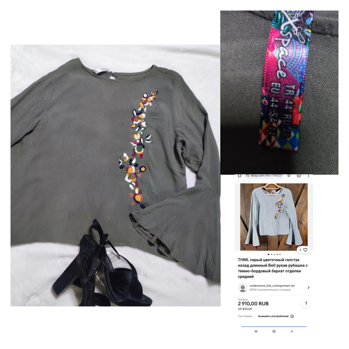Всем привет! В этом месяце у меня случился великий срыв моей "секонд-диеты". Я позволила себе накупить очень много одежды на перепродажу, а ещё запаслась куклами. Конечно же большая часть кукол приобреталась для себя лично, но об этом в следующем обзоре. О тратах ничуть не жалею, так как получала огромное удовольствие от посещения магазинов. Заметила, что я сейчас поменяла свой ассортимент закупок на продажу . И, судя по результатам - в лучшую сторону. Потому что многое из того, что я сейчас выставляю -процентов 40 покупают в течении недели. Для меня это "прорыв") 1.Блузка Bluexspace. Цена покупки 50 рублей. Блуза винтажная, с вышивкой, очень красивый темно зелёный цвет. Манжеты по типу клёш. 2. Платок винтажный qiana Продолжаю выставлять на Авито винтажные платки. Обычно это 100% синтетика, но ткань у них не скользкая, текстурная и приятная на ощупь. Здесь ещё и обработка ручная швов оказалась. Не особо много информации о бренде в интернете. Но глядя на другие работы этого п