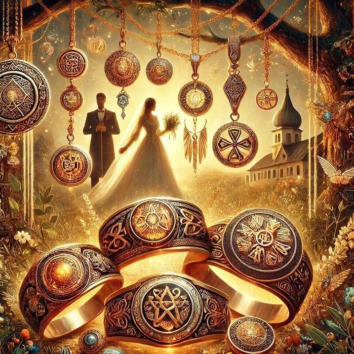 Свадьба – это не только торжественное событие, но и сакральный обряд, имеющий древние корни. В славянской культуре особое внимание уделялось защите новобрачных от негативных энергий и злых сил. Считалось, что молодожёны особенно уязвимы в день свадьбы, поэтому их окружали особыми оберегами, включая ювелирные изделия. Сегодня традиция украшений-оберегов не потеряла своей актуальности, и многие пары стремятся включить в свадебные наряды символические элементы, несущие защиту и благополучие. Славяне издавна использовали обереги в свадебных ритуалах. Они верили, что украшения с защитными символами способны уберечь новобрачных от сглаза, злых духов и негативного влияния недоброжелателей. В качестве свадебных оберегов использовались: Свадебное кольцо является не просто украшением, а мощным талисманом, который символизирует вечность союза. У славян существовала традиция создавать кольца с гравировкой узоров: например, солярных символов (Колядник, Ладинец), которые защищали любовь и приносили