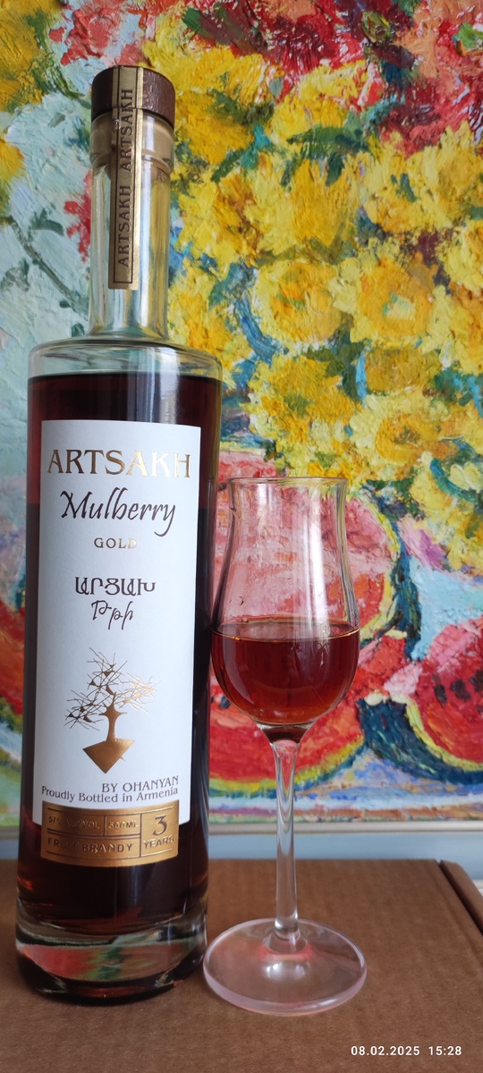 Всем привет от меня, КОньячного Маньяка и наших друзей! И, наконец, у меня на столе тутовка всех тутовок. Арцах тутовый Золотой. Ручной сбор урожая. Спелые плоды отбирают и оставляют для брожения. Ферментация фруктового сусла в емкостях из нержавеющей стали при температуре 18 - 23°С в течение 7 дней. Двойная дистилляция сброженного сусла. Тройная фильтрация. Добавление умягченной воды до достижения напитком требуемой крепости. Минимальный срок выдержки фруктовых дистиллятов 3 года в бочках из тутового дерева (используют новые и старые бочки). Крепость 57%. Розлив 08.2023. Цвет уже совсем тёмно-янтарный. Гуще и консистенция, никаких ординарочных капель здесь уже и в помине. Аромат также интенсивнее, чувствуется уже за пределами бокала. Не удивительно, учитывая максимальную крепость, но то, что и вблизи он будет ровно таким же мягким и нерезким как и у серебряного брата я совершенно не предполагал! А это оказалось фактом! Более того, аромат встретил меня ничем иным как хересным запа