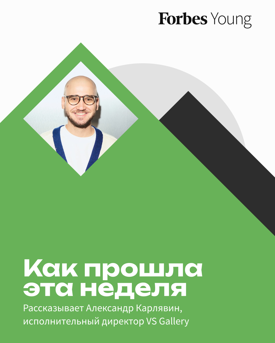 Сегодня в рубрике «Как прошла эта неделя» о своей жизни рассказывает 32-летний исполнительный директор VS Gallery Александр Карлявин. Как прошла неделя? Насыщенно: много встреч с покупателями, утверждение концепций будущих мероприятий в галерее и вне ее. Чем ты занимаешься и каким был путь в сферу искусства? Я работал в сфере тяжелой промышленности и занимался инвестиционным анализом. Потом решил сменить вектор деятельности и прошел профессиональную переподготовку в бизнес-школе RMA. Около пяти лет работал в МАММ, а сейчас я исполнительный директор галереи фиджитал-искусства VS Gallery (с англ. physical и digital — физический и цифровой — сочетание цифрового и физического опыта, в том числе AR и VR). Параллельно преподаю в МГИМО, ИТМО и в других вузах. Основной фокус работы — вывод галереи на международный рынок. В далекой перспективе хочется уйти от операционной деятельности и заниматься стратегическим развитием галереи, в том числе открытием филиалов в других странах. Чем т