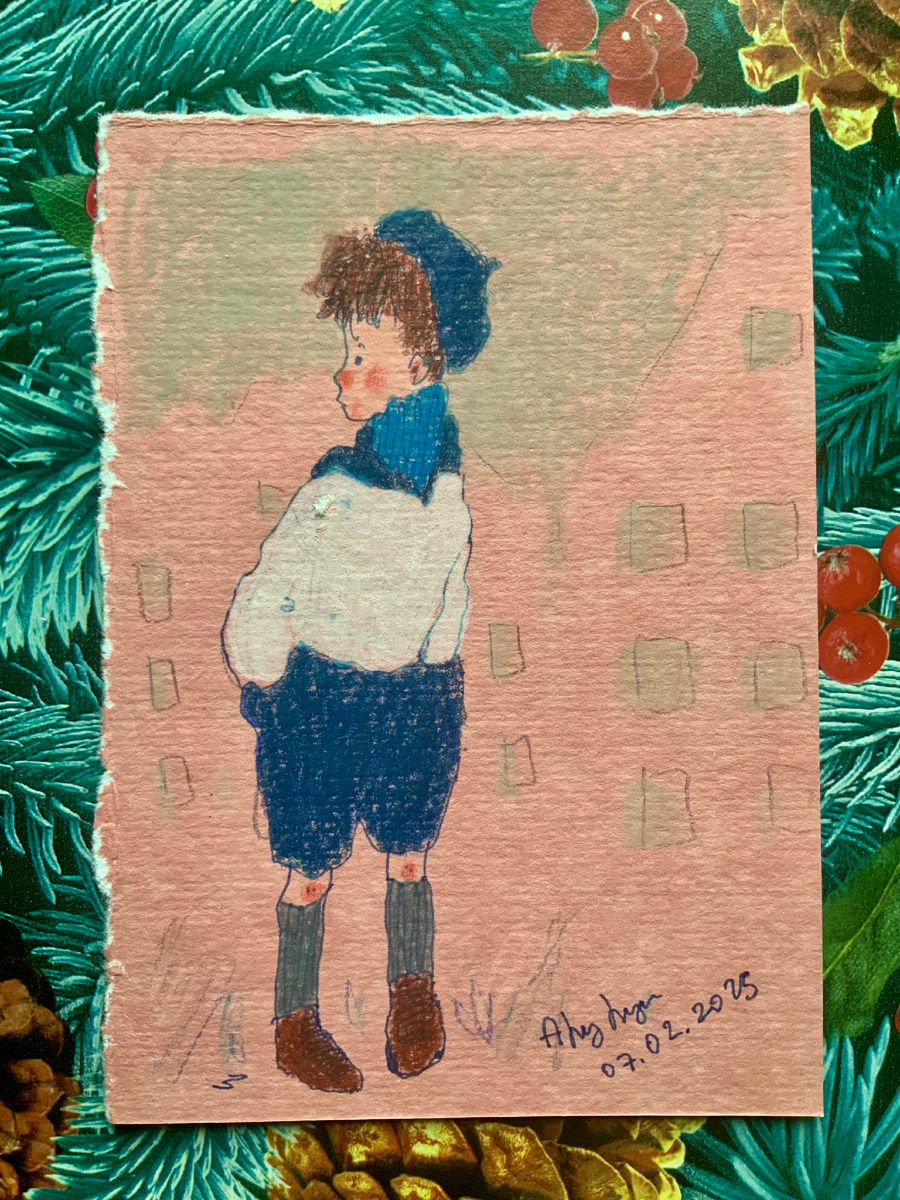Еще один морячок. Нарисован на тонированной бумаге для сухой пастели. Бумага фактурная, из-за чего при закрашивании более фактурными остановятся и ткани, из которых сшита одежда персонажей. * Очень нравится мне морская тема, матросские костюмы, в т.ч. на детях. Рисунки и картины, а также фотографии с изображением людей в морских костюмах всегда вдохновляли меня. До такой степени, что мне казалось, будто матроски носили даже те персонажи, которые не носили их вовсе :)) * Глядите! Валентин Серов, «Дети»: Почему-то мне казалось, что эти дети были одеты в матроски. Но нет. Они одеты в обычные рубашки и брючки. К тому же, мне казалось, что ребята стоят на палубе корабля, а не на террасе. Это какие-то странности восприятия! И все равно, это картина с морской тематикой. Поэтому Сашу и Юру можно считать матросами тоже :)) * Джесси Уиллкокс Смит. Мне казалось, что эта художница и иллюстратор рисовала больше детей в матросках. На самом деле таких рисунков у нее сравнительно немного. И онлайн я н