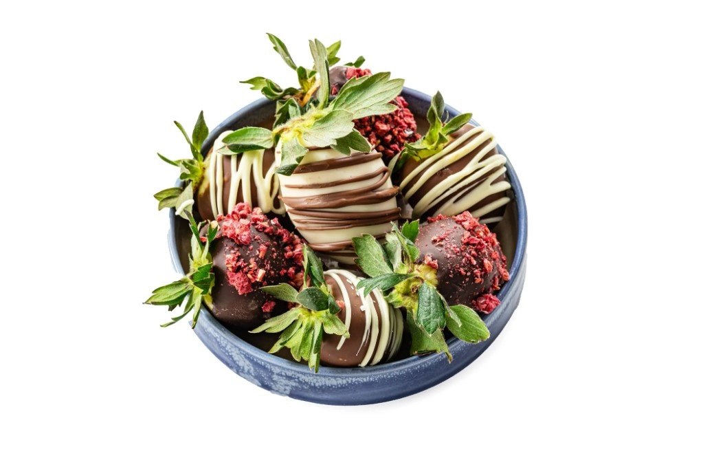 5.Пока шоколад не застыл, посыпать клубнику сублимированной малиной (или другими сублимированными ягодами).