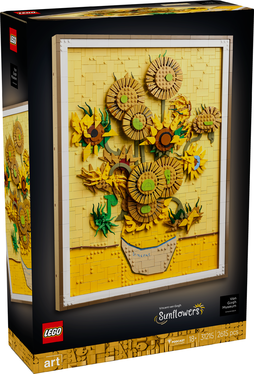 Привет-привет, сегодня изучим флагманский набор конструктора LEGO 2025 года из серии «ART». Заполучив лицензию на работу с шедеврами голландского художника Винсента Ван Гога для выпуска невероятной картины из деталей «Звёздная ночь» №21333, The Lego Group решило не останавливаться. В сотрудничестве с музеем Ван Гога выходит следующая картина – «15 подсолнухов», которую мы в данной статье обсудим и рассмотрим со всех сторон. Достоин ли данный шедевр того, чтобы висеть в вашем доме? А вот и коробочка от набора. На этот раз не «Ideas», а «Art». Также сменился музей, вместо «Музея современного искусства» (MoMA) в Нью-Йорке стал «Музей Ван Гога» в Амстердаме. Привычный дизайн упаковки для 18+ комплектов конструктора. Также особо отмечаем количество деталей: 2615 шт. Довольно крупный комплект у нас получится в итоге! А вот и сам набор. Внушительное количество оттенков жёлтого, сочетаются с жемчужно–золотым, темно-коричневым и оливково-зеленым, чтобы показать различные стадии цветения подсолн