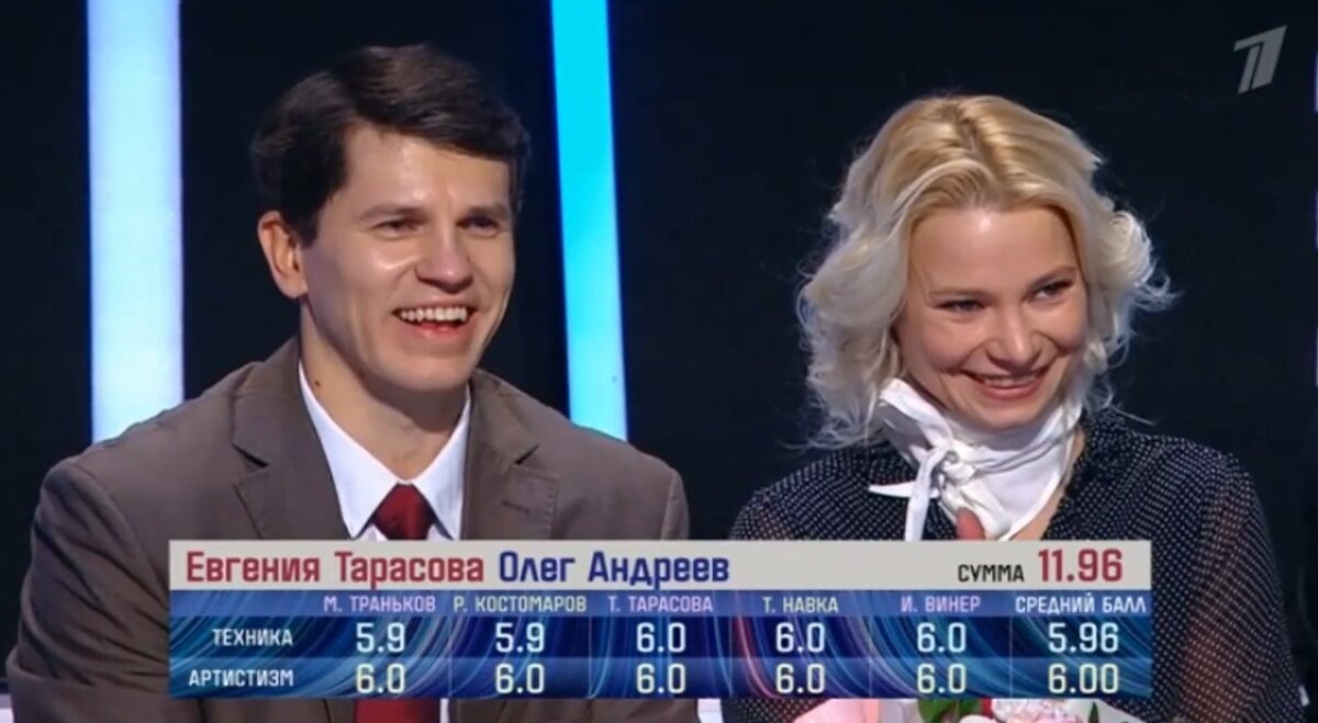 Темой нового выпуска шоу «Народный ледниковый» на Первом канале стало российское кино разных времен и жанров. Евгения Тарасова и «народник» Олег Андреев поставили номер в стиле детективного фильма «Тегеран-43». Фигуристка исполнила роль переводчицы, а ее партнер – детектива. Во время проката пара допустила несколько ошибок, но большинство членов жюри не обратили на них внимания и поставили 6.0, кроме Максима Транькова.