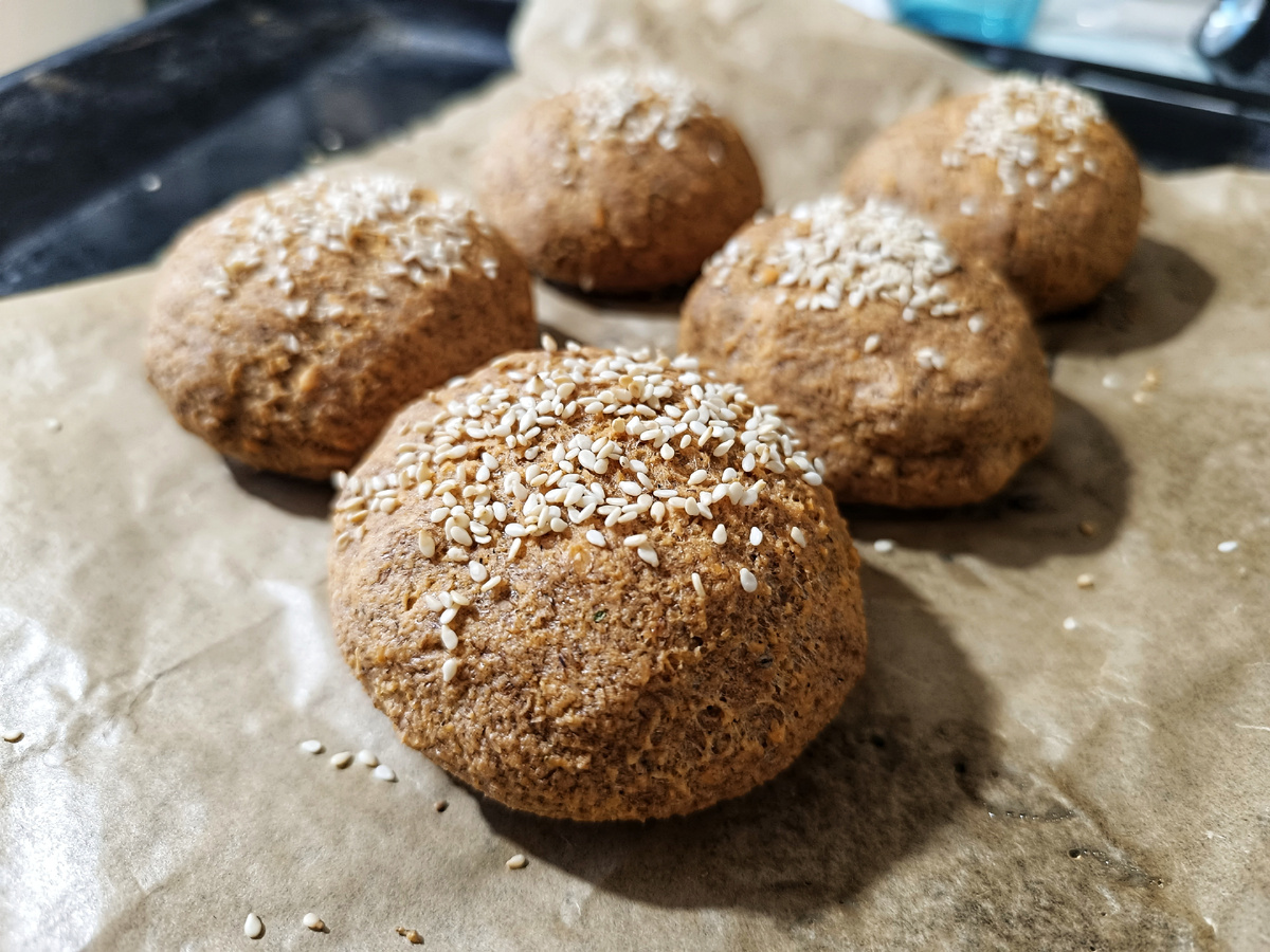 Как я ранее писала, что в творческих поисках рецепта идеального хлеба без глютена и сахара. Один такой не хлеб я нашла. Это чечевичные булочки. Готовятся они очень быстро и просто, а состав просто волшебный. А с тех пор, как у меня выявили пониженный уровень ферритина, то чечевицу я стала очень уважать. Ведь в ней много железа, белка и витаминов группы В. Что может быть идеальнее для усвоения железа организмом? Чтобы приготовить 5-6 булочек примерно по 70-80 грамм каждая нам потребуется: ПРИГОТОВЛЕНИЕ: Красную чечевицу замачиваем на ночь в воде. Утром чечевицу промываем пару раз и сливаем максимально воду. Затем чечевицу, воду, оливковое масло, соль и специи пробиваем погружным блендером до пюреобразного состояния. После чего добавляем разрыхлитель и псиллиум и хорошенько перемешиваем. Накрываем тесто пакетом и оставляем на 20 минут. После чего мокрыми руками формируем булочки и выкладываем их на противень. Сверху посыпаем их кунжутом или семечками. Ставим в разогретую до180 град