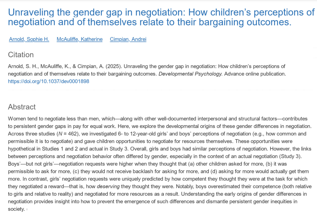 ТЕЛЕГРАМ КАНАЛ ПСИХОЛОГИИ - приглашаю Гендерный разрыв в уверенности в себе начинается уже в возрасте 6 лет. Данные: Девочки были менее склонны торговаться за премию, чем мальчики — они не чувствовали, что заслужили ее, даже когда заслужили. Мальчики просили больше, даже если это не было оправдано. Все дети должны научиться просить то, чего они заслуживают. Аннотация (исследователи универа Нью- Йорка) Женщины склонны вести переговоры реже, чем мужчины, что, наряду с другими хорошо документированными межличностными и структурными факторами, способствует сохранению гендерных различий в оплате за равный труд. Здесь мы изучаем истоки развития этих гендерных различий в переговорах. В трех исследованиях (N = 462) мы исследовали восприятие переговоров девочками и мальчиками в возрасте от 6 до 12 лет (например, насколько распространено и допустимо вести переговоры) и давали детям возможность самим вести переговоры о ресурсах. Эти возможности были гипотетическими в исследованиях 1 и 2 и р