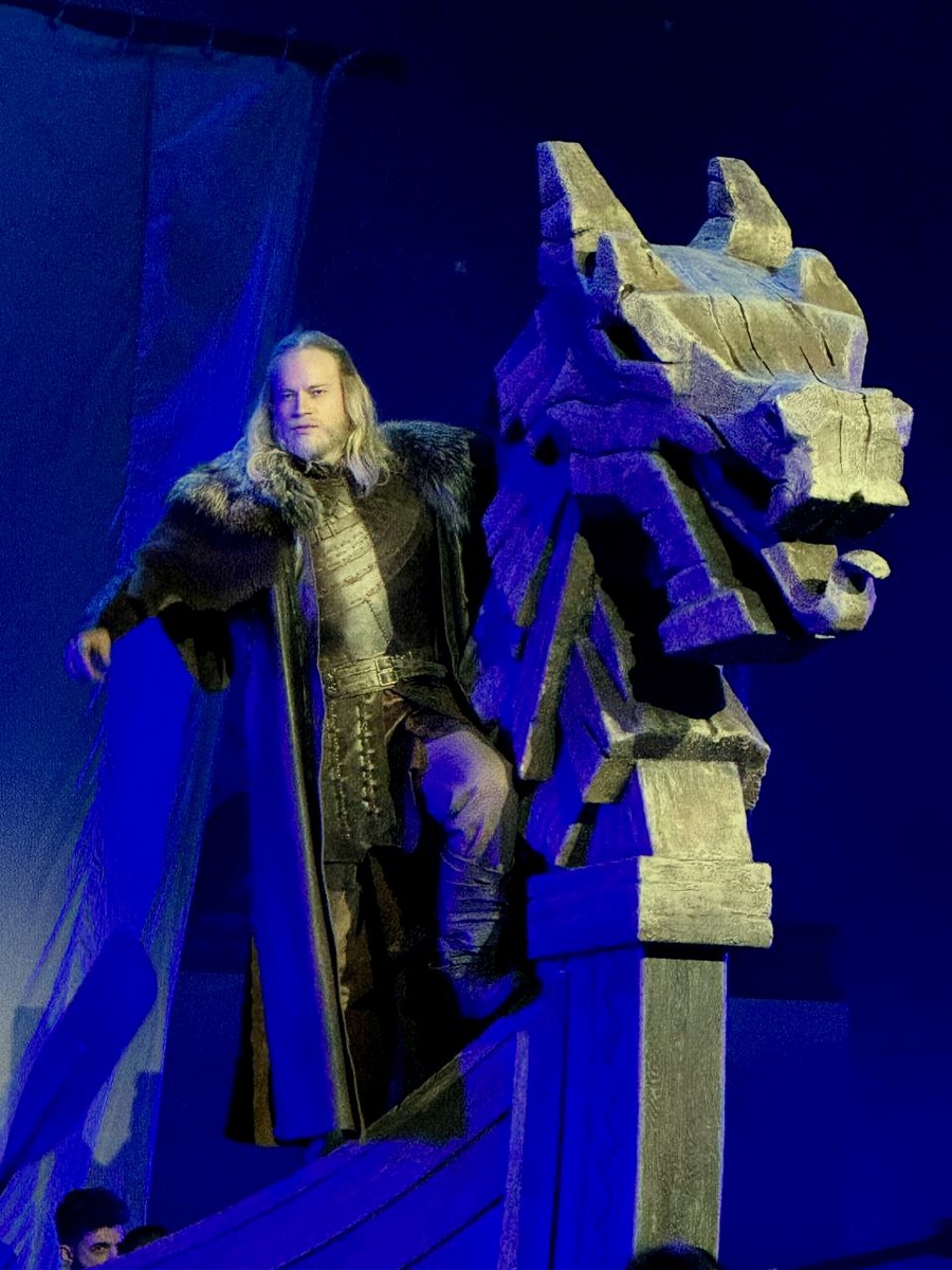 И вот появляется главный сценографический сюрприз — драккар. «Конь морской», древний боевой корабль викингов, выдающаяся работа молодого арт-директора проекта Анастасии Тимчук. Создавала она ее — цитирую - «тщательно погружаясь в детали и изучив кучу материалов» более четырех месяцев. Результатом работы целой команды стало инженерное чудо, красавец 13 метров в длину, весом три с половиной тонны, выдерживающий с полным соблюдением безопасности 20 человек на борту. Металлокаркас, специальные доски, огромный парус с алой литерой «В». Выразительная драконья морда на носу. Когда драккар разворачивают вдоль сцены — он занимает ее почти полностью (ширина сцены КДС 16,7 м).