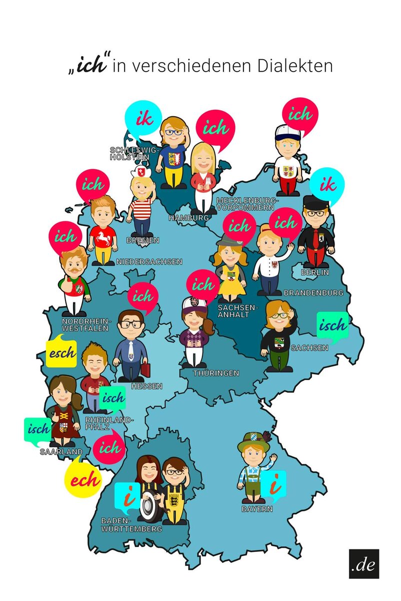 Ну что, возвращаемся к немецким диалектам! 🫶🏼 Тема интересная, тема сложная и очень многогранная! 📎Но остановимся на самом интересном: ⭐По произношению местоимения ich можно многое сказать о говорящем. Ладно, не многое, но можно попробовать угадать его происхождение. Думаю, все вы знаете классический вариант ich как ихь. А вот слышали ли вы баварское произношение i ? Обязательно посмотрите на карту ниже, там ещё больше вариаций ✨Произношение буквы s может выдать южного немца. В общем, чем южнее, тем чаще встречается звук /sch/ там, где по нормам должно произноситься /s/. Например, вместо привычной /Wurst/, услышим /Wurscht/. 💫А если вы хотите попросить южного немца прочитать вам слово по буквам *buchstabieren, то мой вам совет, этого НЕ делать, особенно если в слове точно встречаются /p,t,k,b,d,g/. Конечно же, это шутка. Просто на юге Германии глухие звуки /p, t, k/ озвончаются. То есть и вправду можно не понять, имеется ввиду k или g. Но для таких случаев имеется фонетическ
