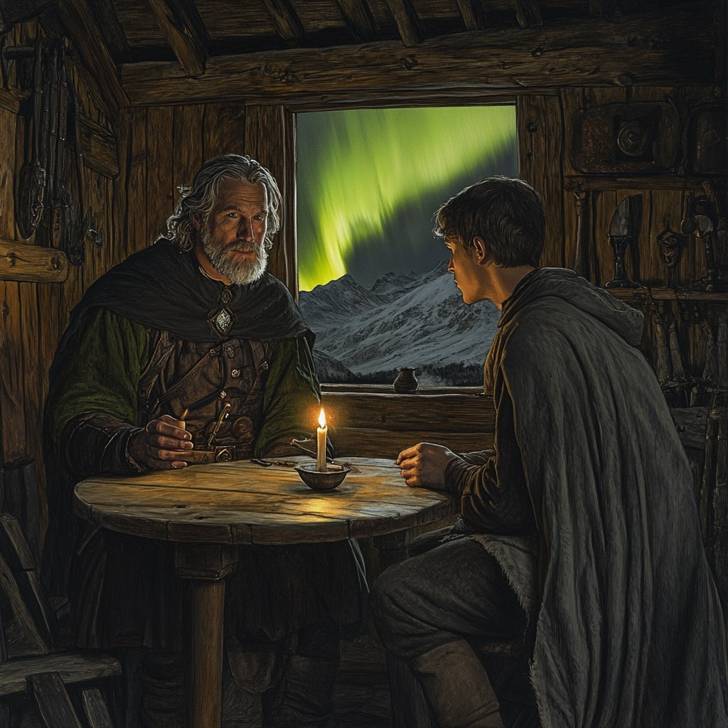 Лязгнул железный засов, глухо скрипнули давно не смазываемые петли — и порыв северного ветра едва не задул свечу, ворвавшись в жилище сквозь узкую щель. Которую тут же сделали больше ухватившиеся за шершавую деревянную поверхность тонкие, бледные пальцы. Топтавшийся снаружи пришлец, вопреки лютому холоду, не имел перчаток, и плащ его — тонкий, мшисто-зелёный, с причудливой вышивкой по краю — явно ни от чего не защищал. Не по сезону одёжа…