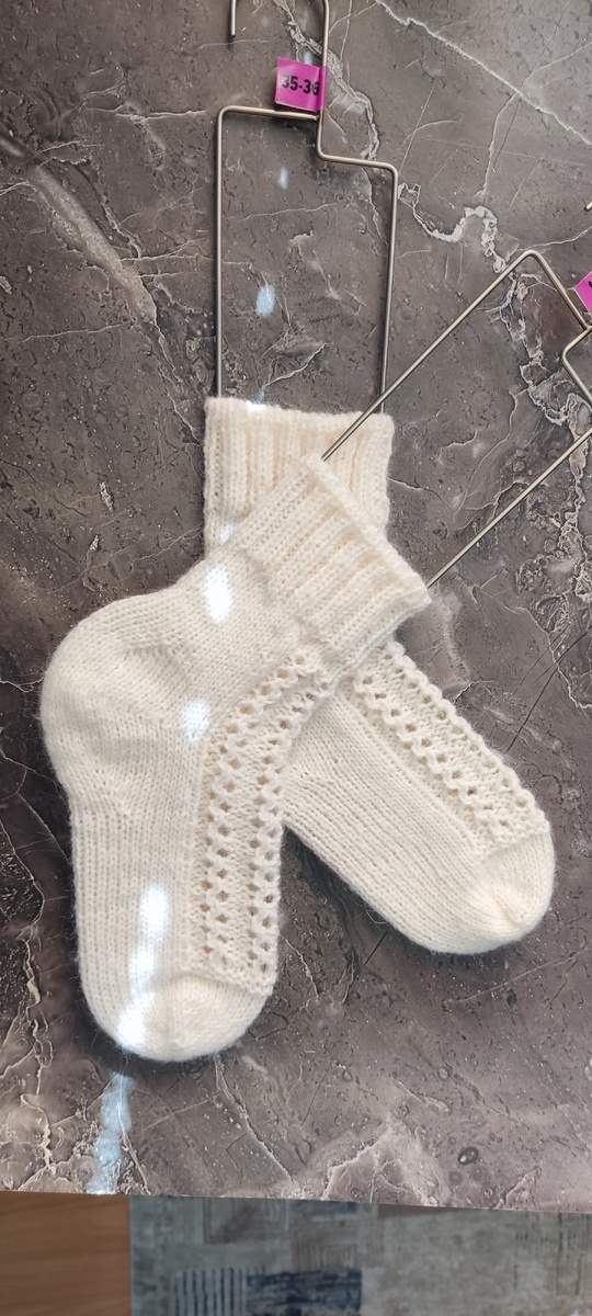Эти носочки я вязала для своей коллеге по работе на ее день рождение. Каждый год я для своих коллег вяжу какую-нибудь новую коллекцию. Например, с кидмохером, с бамбуком, жаккардовые или полосатые и так далее. Эти носочки вязала из пряжи Ализе супервош молочного цвета. Метраж пряжи стандартный - 420м/100г, с подмотом из бобинного мохера 1000м/100г. И это пушистая коллекция. Размер на дюймовочек - 35-36. Спицы взяла 2.5мм, потому что вязала с подмотом. Носочки связаны от мыска на 48 петель - мой любимый метод вязания. Вязала их методом "magic loop". Пятку решила сделать методом прибавок и убавлок по стопе - ещё ее называют пятка "от скуки". Паголенок на 52 петли. Резинка 2*2 на 56 петель. Закрыла иглой.