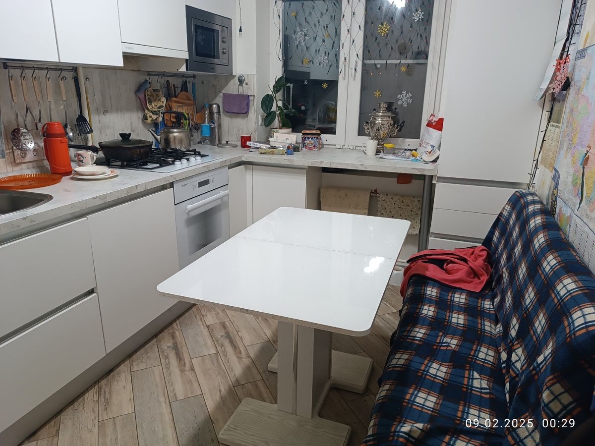 - Диван на кухню побольше, чтобы на нём можно было ночевать. Но тогда нужно будет наш обеденный стол заменить на совсем маленький, а то диван не влезет.
