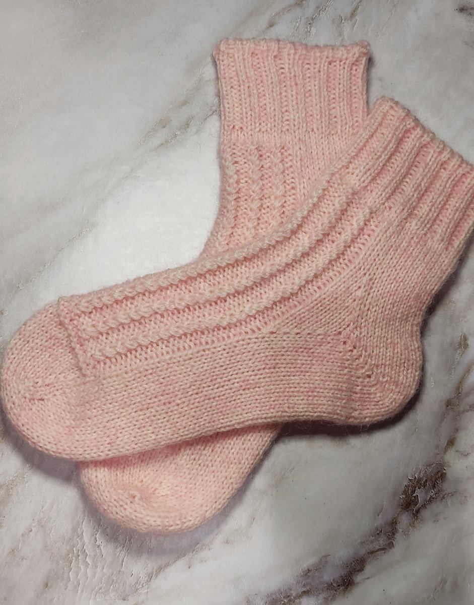 Носочки связаны из пряжи Ализе артисан молочного цвета 420м/100г с подмотом из бобинного розового мохера 1000м/100г. Размер 36-37. Спицы 2.25мм. Связаны от мыска на 52 петли. Пятка "бумеранг". Клин подъёма - 6 петель.Погаленок на 56 петель. Резинка 2*2 на 60 петель. Закрыто иглой. Подарила)))