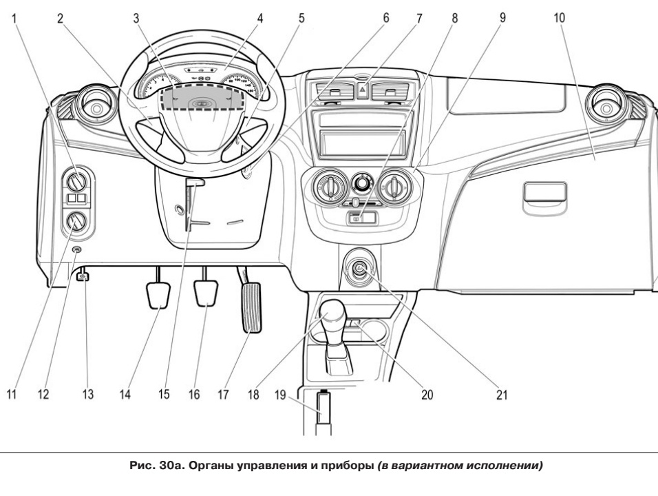 ЗОНА РАСПОЛОЖЕНИЯ ПЕДАЛЕЙ Педали При управлении педалями акселератора, тормоза и сцепления (см. рис. 30а, 30б, пози ции 17, 16 и 14) ничто не должно мешать и препятствовать их полному ходу. Используйте только такие коврики на пол, которые не мешают управлению педалями и могут быть надежно закреплены. ВНИМАНИЕ! Не кладите никакие предметы на пол перед и под сиденьем водителя. Предмет при торможении может попасть в зону размещения педалей и препятствовать нормальному управлению ими. При необходимости предотвратить столкновение или быстро совершить какой-либо маневр Вы будете не в состоянии экстренно затормозить, резко выжать сцепление или прибавить газ.