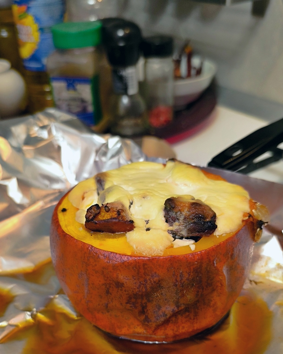 ■ Полученной смесью начиняем тыкву, заливаем сметаной и отправляем в духовку на 20 минут.