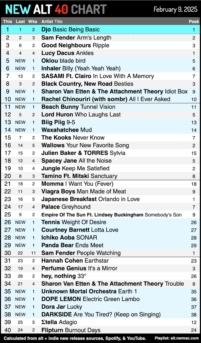 INHALER, SHARON VAN ETTEN, RACHEL CHINOURIRI, BEACH BUNNY, BIIG PIIG, WAXAHATCHEE, TENNIS, COURTNEY BARNETT, ICHIKO AOBA, и PANDA BEAR также дебютируют в ТОП-30.