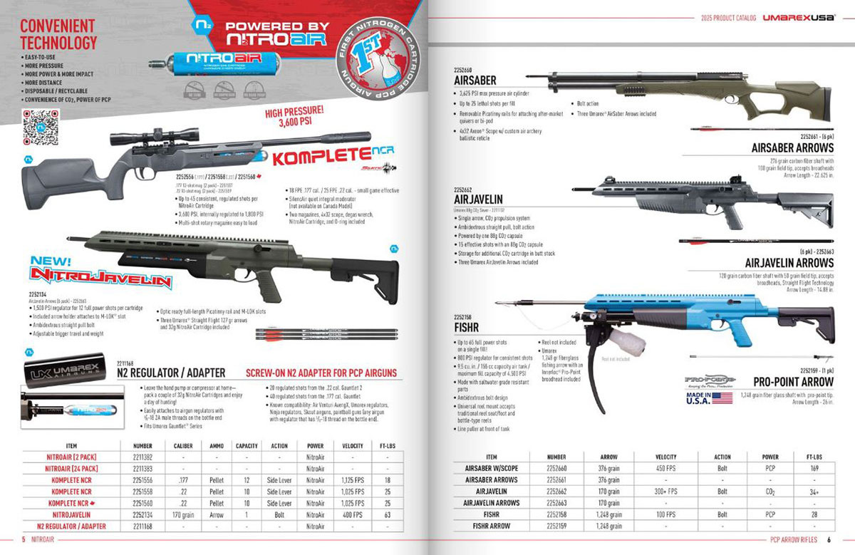 Открывает ее "Umarex Komplete NCR", а ниже расположено изображение новинки 2025 года - пневматического арбалета (если точнее, то стреломета, поскольку к настоящим арбалетам изделие отношения не имеет) "NitroJavelin". О нем чуть подробнее.