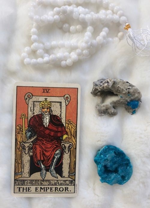 Император изображает бородатого мужчину, сидящего на троне со скульптурными изображениями баранов по углам. Он держит в руке посох и украшен красным одеянием, которое символизирует его силу и авторитетность. На голове у него корона, символизирующая высшую власть. Четыре Барана: Символизируют связь Императора с планетой Марс и Овном. Поскольку здесь четыре барана, это будет численно символизировать основы. Символ упорства, твёрдости намерений и умения принимать тяжёлые решения в любой ситуации. Трон: Тронами пользуются люди высокого статуса, члены королевской семьи или на руководящих должностях. Серый цвет трона: Здравомыслие, реализм. Император твердо стоит на земле, он не склонен витать в облаках и предаваться иллюзиям. Доспехи: Доспехи, которые он носит, символизируют защиту от угрозы и экранируют эмоции. Сильная позиция. Также то намек на то, что в любой момент Император может подняться с трона и двинуться в военный поход. Император решителен и отважен. Золотой скипетр Анкх (кре