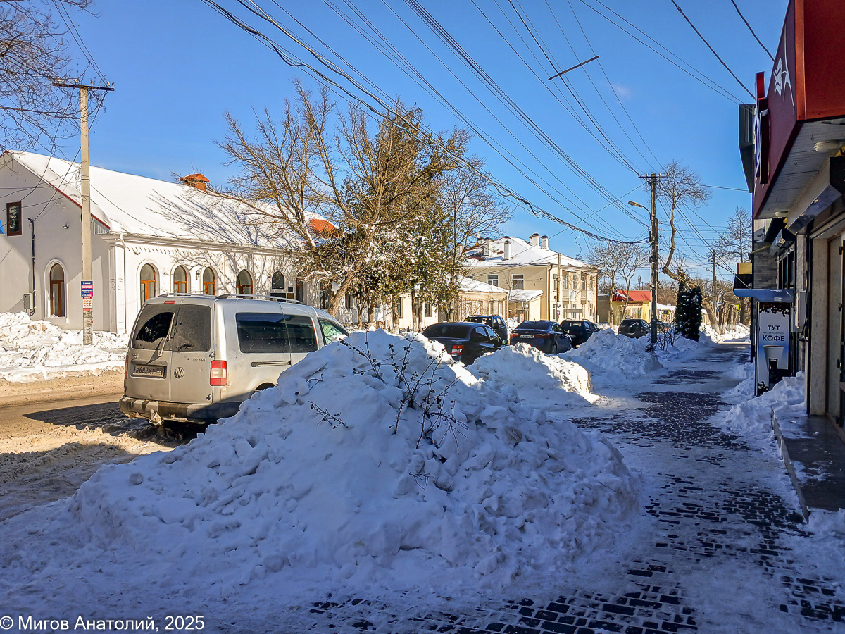 В воскресенье на рынок я решил не ходить. Холодно на улице, минус 6. И скользко. Днём на солнце снег протаивает, а за ночь подмерзает. Но в полдень, когда солнышко неплохо так начало пригревать, отправился в магазин. Три дня назад в Крыму случилось почти стихийное бедствие. Метель и ветер. За сутки почти месячная норма снега. Коммунальщикам и спасателям пришлось потрудиться. На некоторых дорогах машины встали, ни туда, ни сюда. Я в такие дни никуда не выезжаю, да и МЧС заранее предупреждало, но не все прислушиваются, да и бывает, что людям действительно надо ехать. Ну, вроде бы, никто не замерз и не пропал, всем помогли. Кое-где по полуострову были обрывы проводов и люди сидели без света и тепла. Но ремонтники это быстро устраняли. У нас в доме никаких отключений не случилось, но некоторые районы Старого Крыма были обесточены. Не знаю, как было на самом деле, но я читал, что обещали все восстановить в течение трёх часов. Это терпимо. В магазин я шёл по улице Ленина - это главная улица