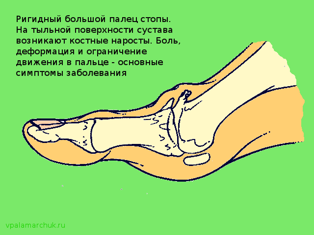 Боль в области большого пальца стопы появляется при тугоподвижности первого плюсне-фалангового сустава стопы, он ограничен в движении, отмечается разрастание костной ткани и воспаление хрящей. Довольно часто это является симптомом подагры, при которой соли мочевой кислоты откладываются в области этого сустава. Поэтому перед началом лечения рекомендуется сдать анализ крови натощак на уровень мочевой кислоты. Подобное состояние развивается вследствие большой нагрузки на палец стопы, в первую очередь это лишний вес и малый размер стопы, фактором хронизации является спазм мышцы, сгибающий большой палец стопы. Для уменьшения боли в области большого пальца стопы рекомендуется расслабить мышцу, сгибающую большой палец, находящуюся в области наружного края голени и провести движения улучшающие подвижность большого пальца руками. Самым эффективным средством для расслабления мышцы является ударно-волновая терапия, эффект появляется после 1-3 процедур. Для профилактики рекомендуется массаж голе