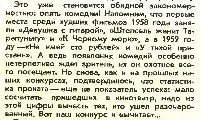 Пять худших фильмов 1958 и 1959 годов - и все комедии - "Девушка с гитарой", "Штепсель женит Тарапуньку", "К Черному морю", "Не имей сто рублей" и "У тихой пристани".